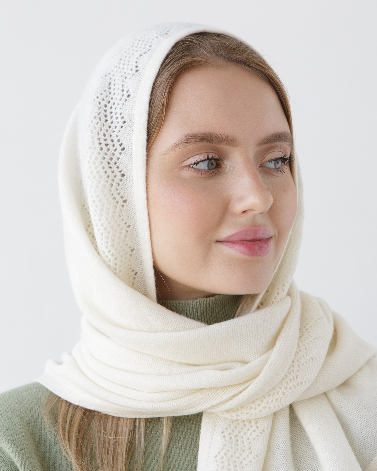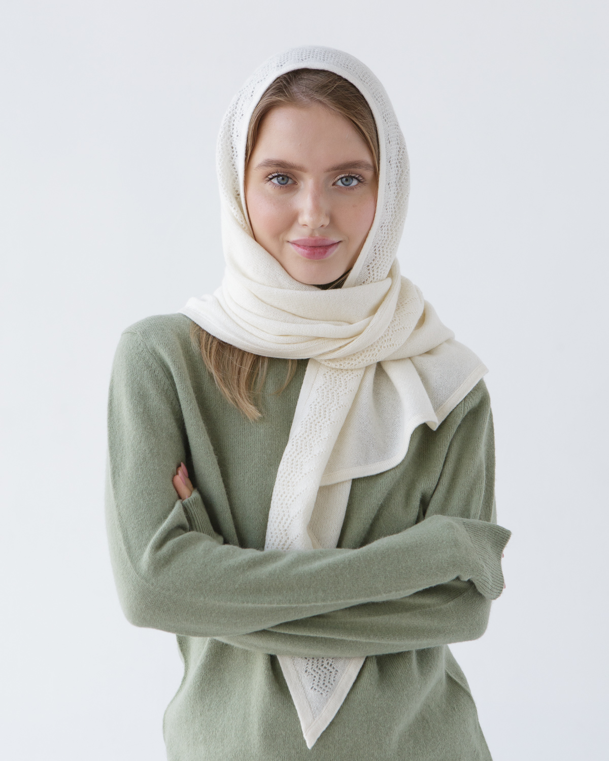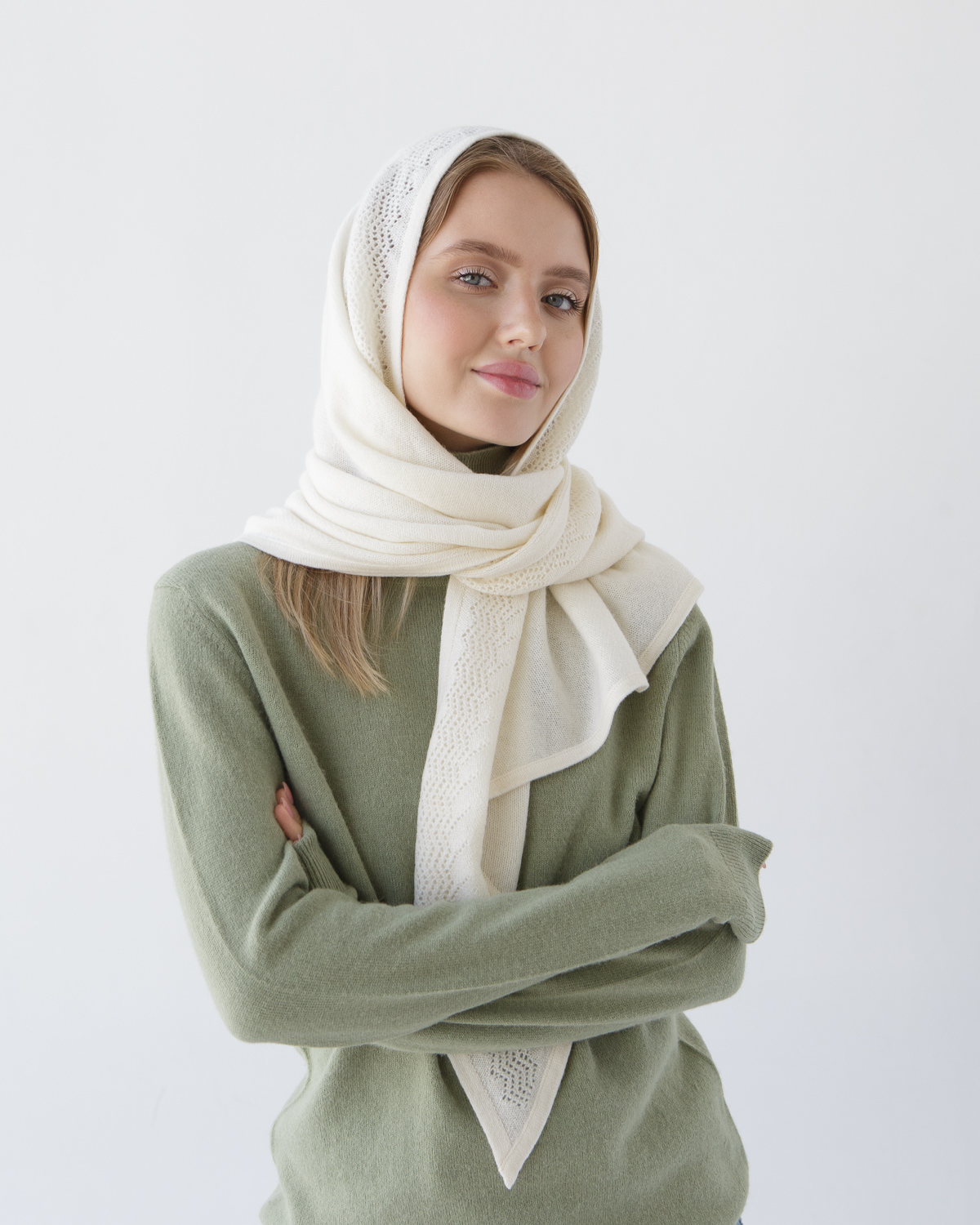 Косынка красиво драпируется, позволяя носить её различными способами: как платок на голову, как шарф или накидку на плечи. Лаконичный дизайн подчёркивает натуральную текстуру кашемира и универсальность модели.
