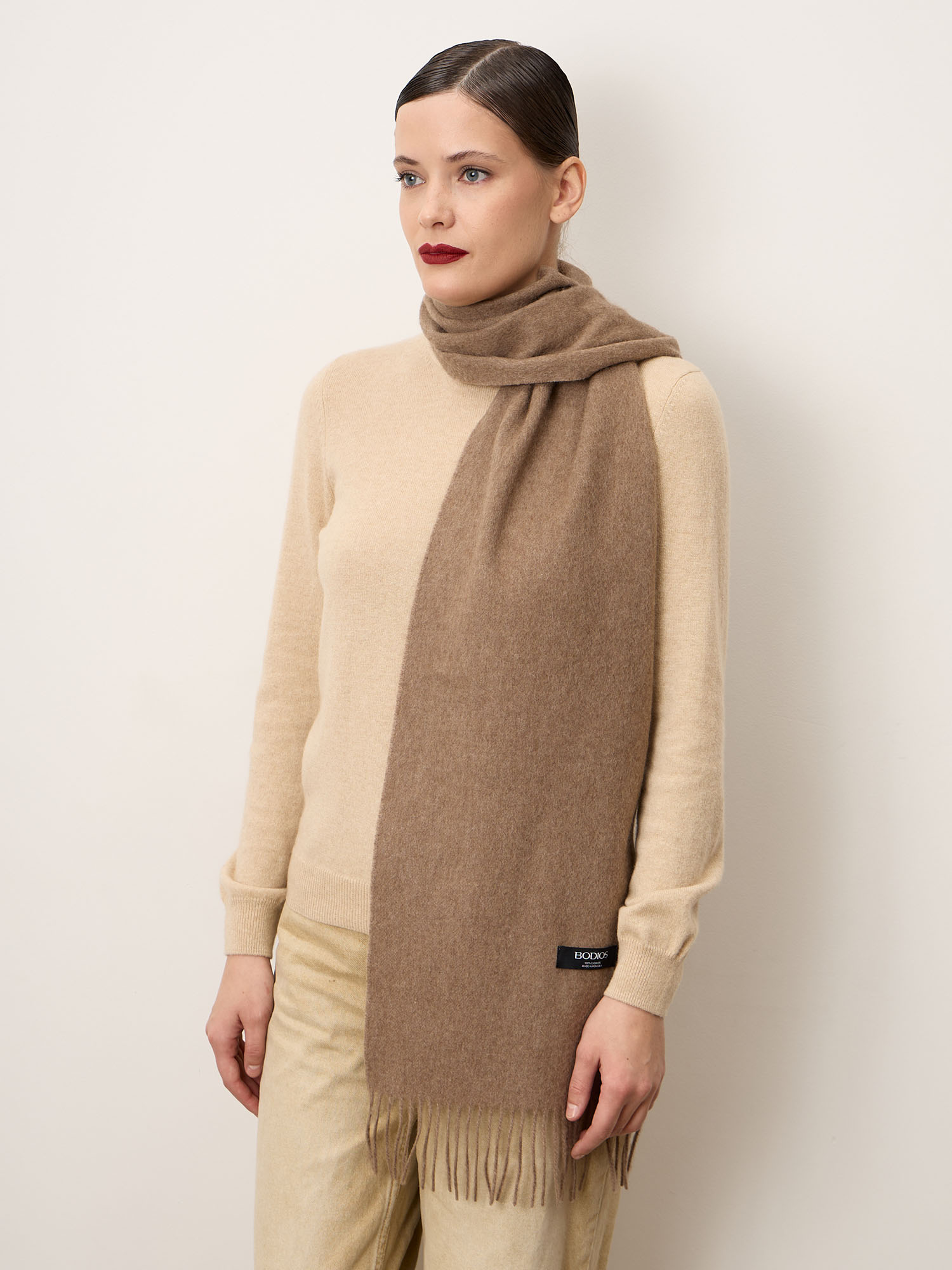 100% натуральный кашемир — лёгкий, тёплый и невероятно мягкий материал. Волокно обладает высокой теплоизоляцией, остаётся дышащим и комфортным для кожи. При правильном уходе сохраняет форму и презентабельный внешний вид.