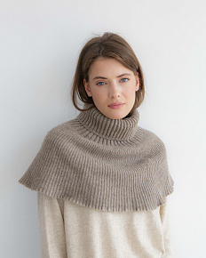 Модель выполнена в виде укороченной накидки с высоким воротником-стойкой. Аккуратная вязка и плавная линия плеч создают аккуратный силуэт. Минималистичный дизайн без лишних элементов делает изделие универсальным и стильным дополнением гардероба.