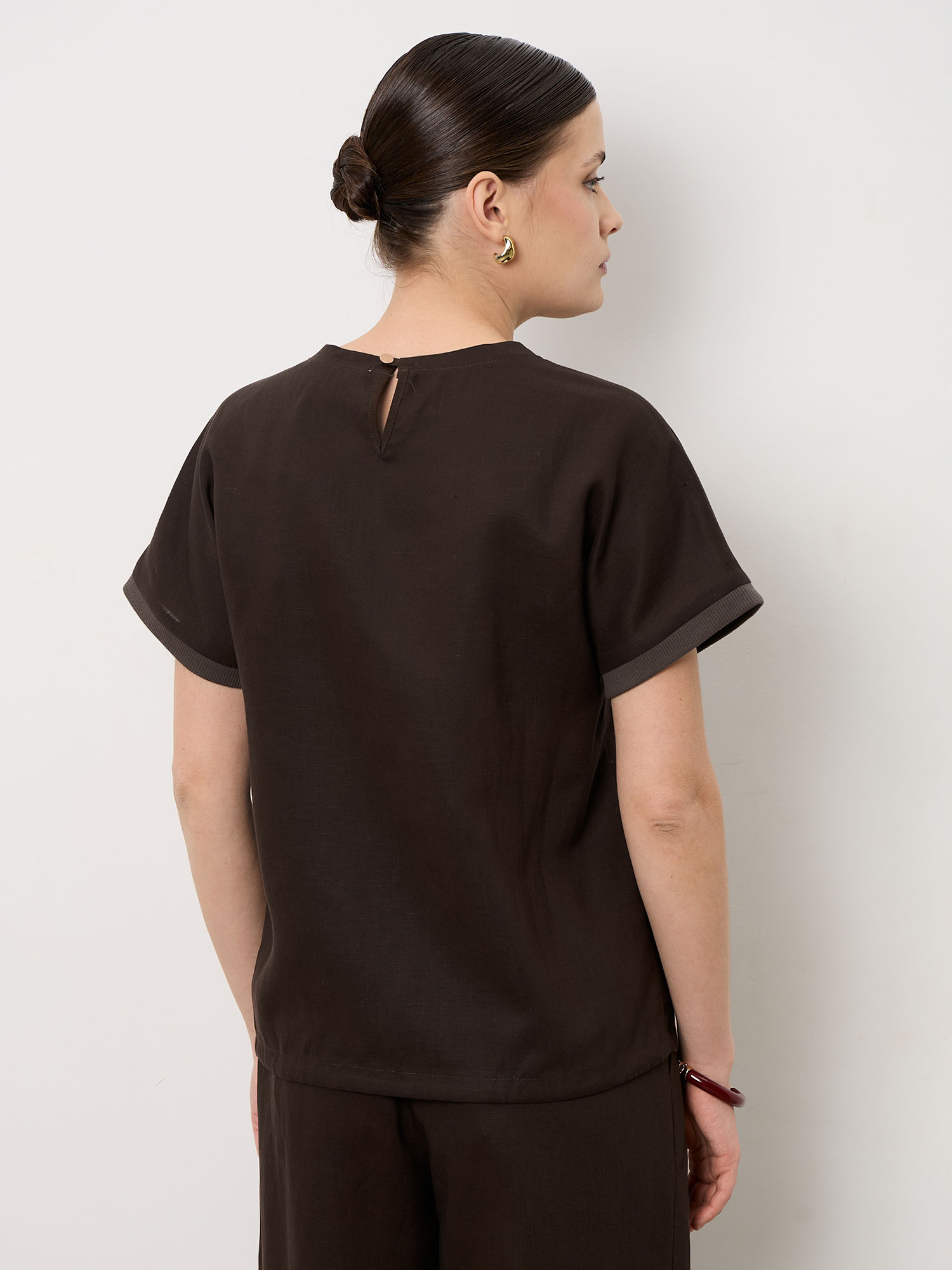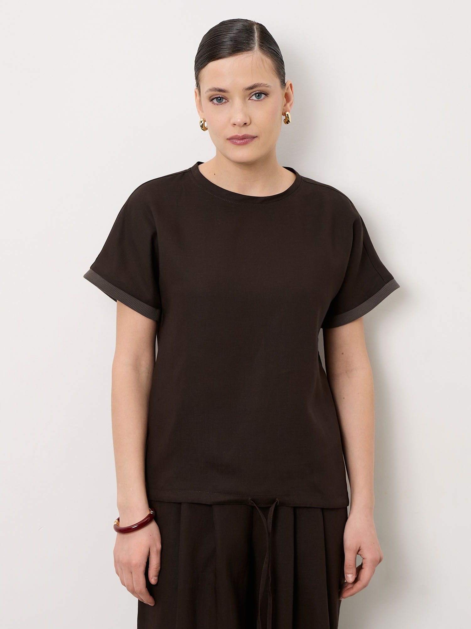 Модель выполнена в минималистичном стиле с аккуратным круглым вырезом и короткими рукавами с лёгким подворотом. Чистые линии и отсутствие лишних деталей делают топ универсальной базой для различных образов.