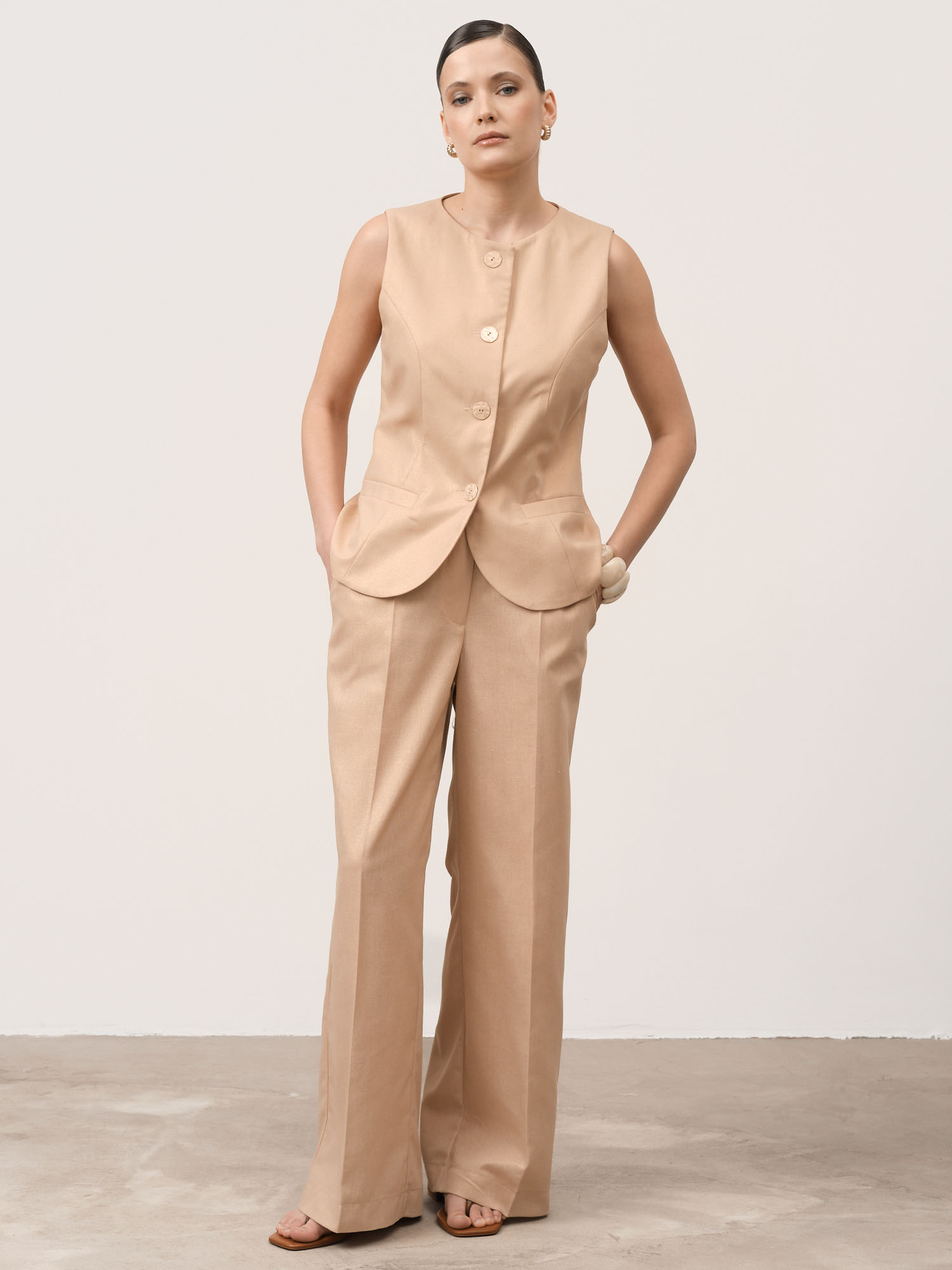 Идеально сочетаются с жилетом, жакетом или блузами из льна и вискозы. Подходят для офисных, повседневных и летних образов.