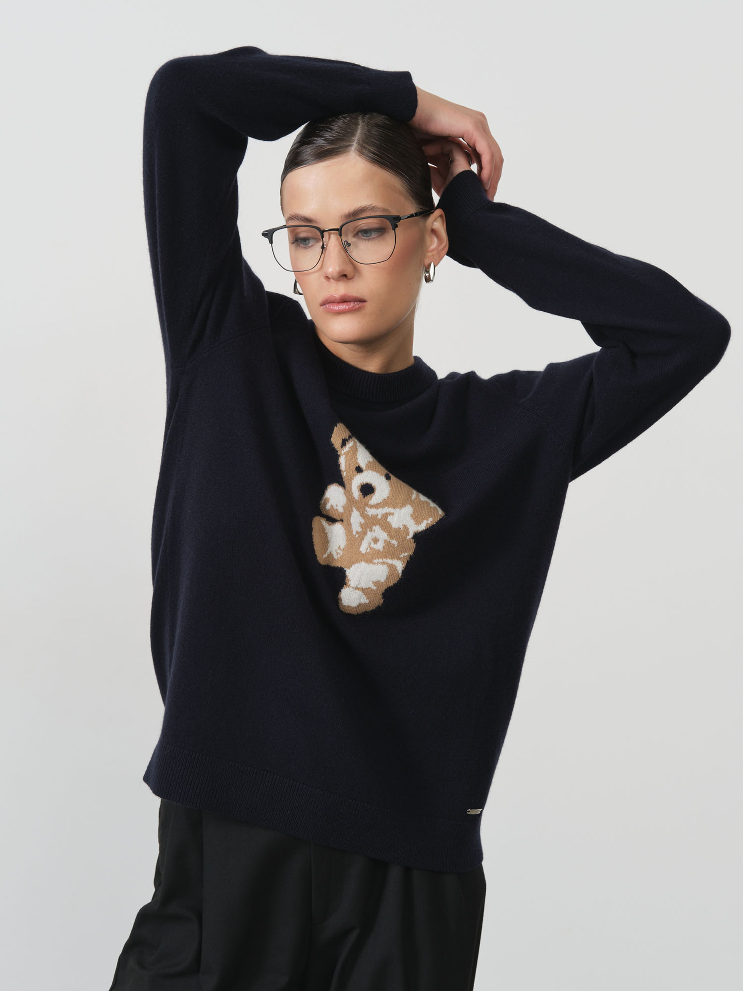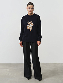 Модель выполнена в прямом силуэте с классическим круглым вырезом и гладкой вязкой. Центральным элементом дизайна является декоративная аппликация медвежонка, которая добавляет изделию индивидуальности и современного настроения.