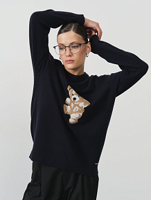 Глубокий тёмный оттенок, близкий к чёрному или тёмно-синему, создаёт контрастный фон для декоративного элемента и делает модель универсальной для сочетания с различными цветами гардероба.
