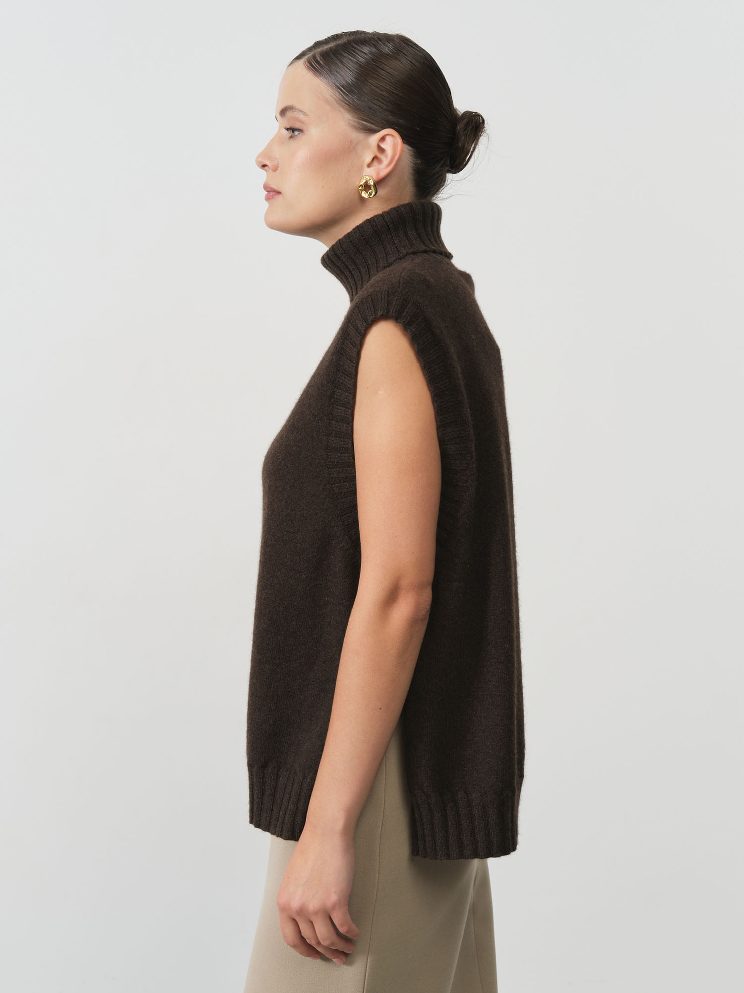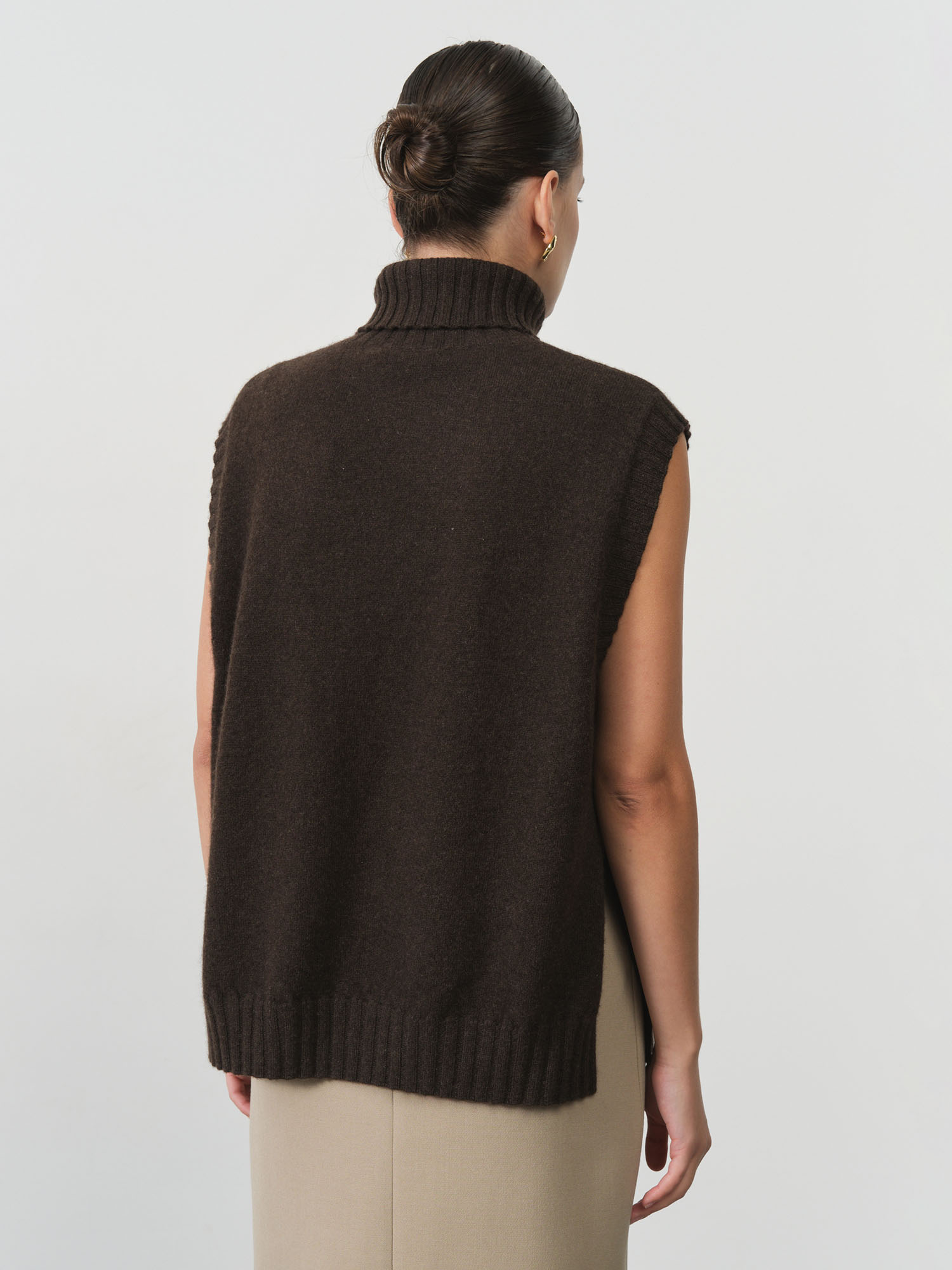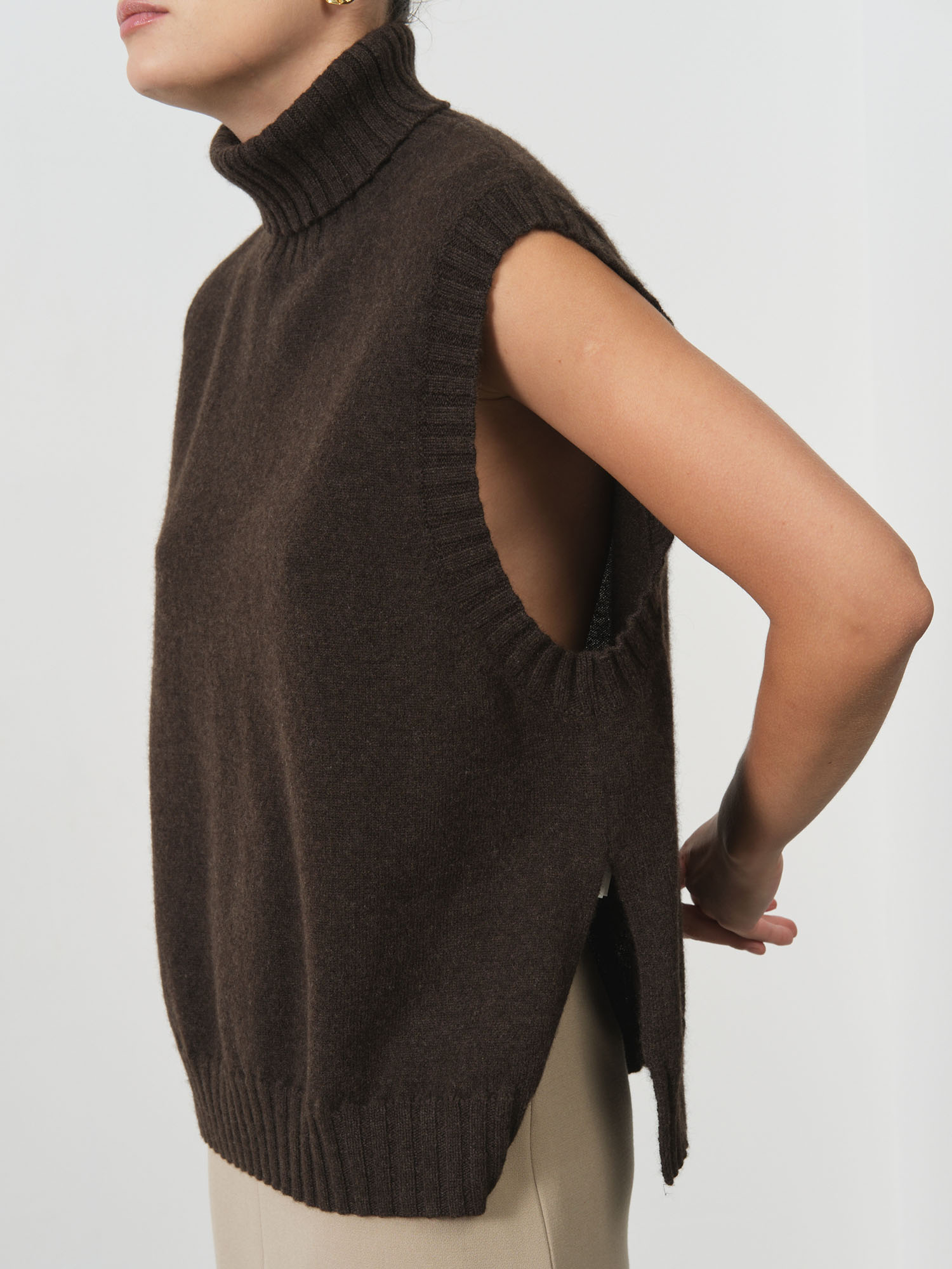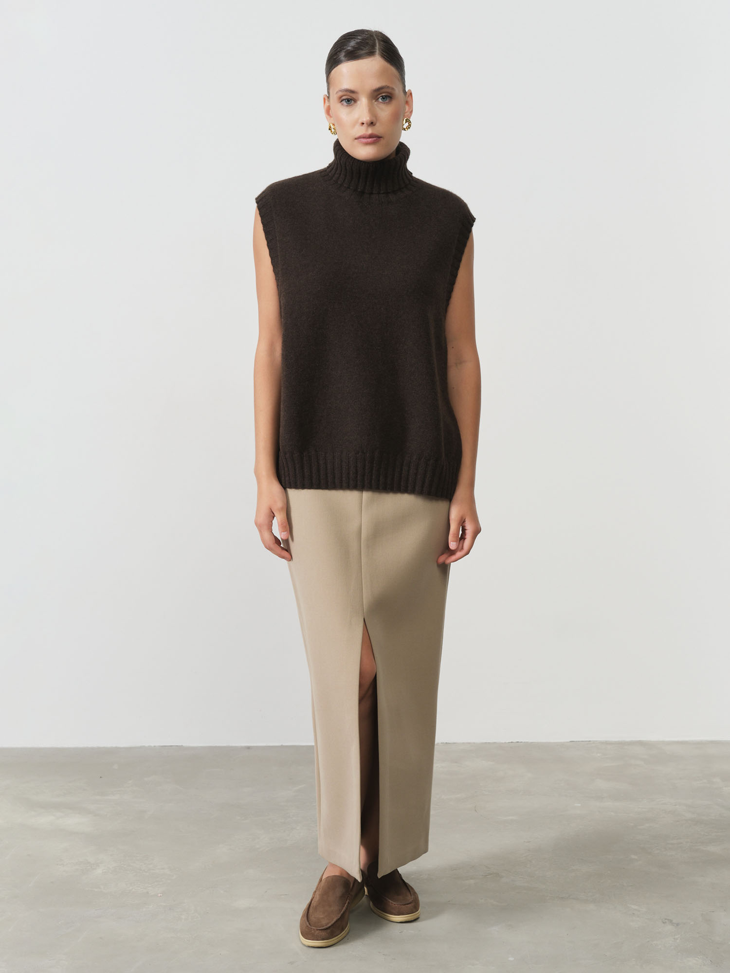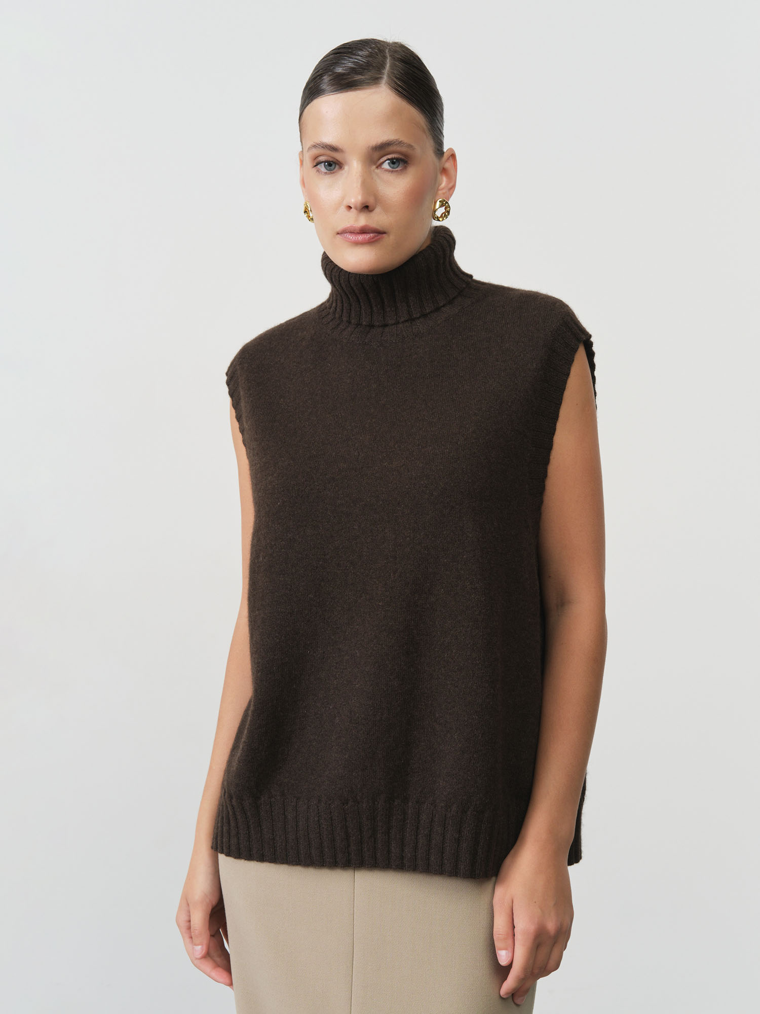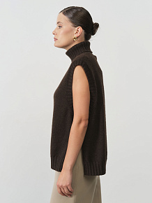 Модель выполнена в виде удлинённого жилета с высоким воротником-стойкой. Гладкая вязка подчёркивает благородную текстуру натурального материала и придаёт изделию минималистичный современный характер.