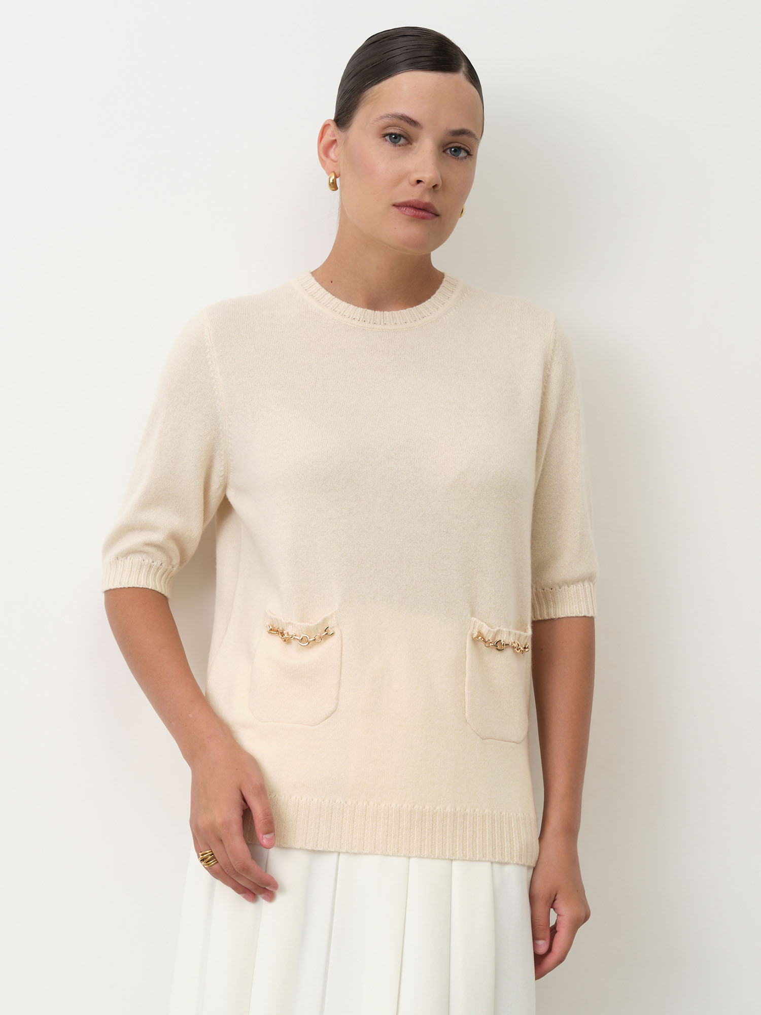 Модель выполнена с круглой горловиной и укороченными рукавами до локтя. Передняя часть украшена аккуратными декоративными карманами с небольшими бантиками, которые придают изделию женственный и изящный акцент. Гладкая вязка подчеркивает благородную текстуру материала.