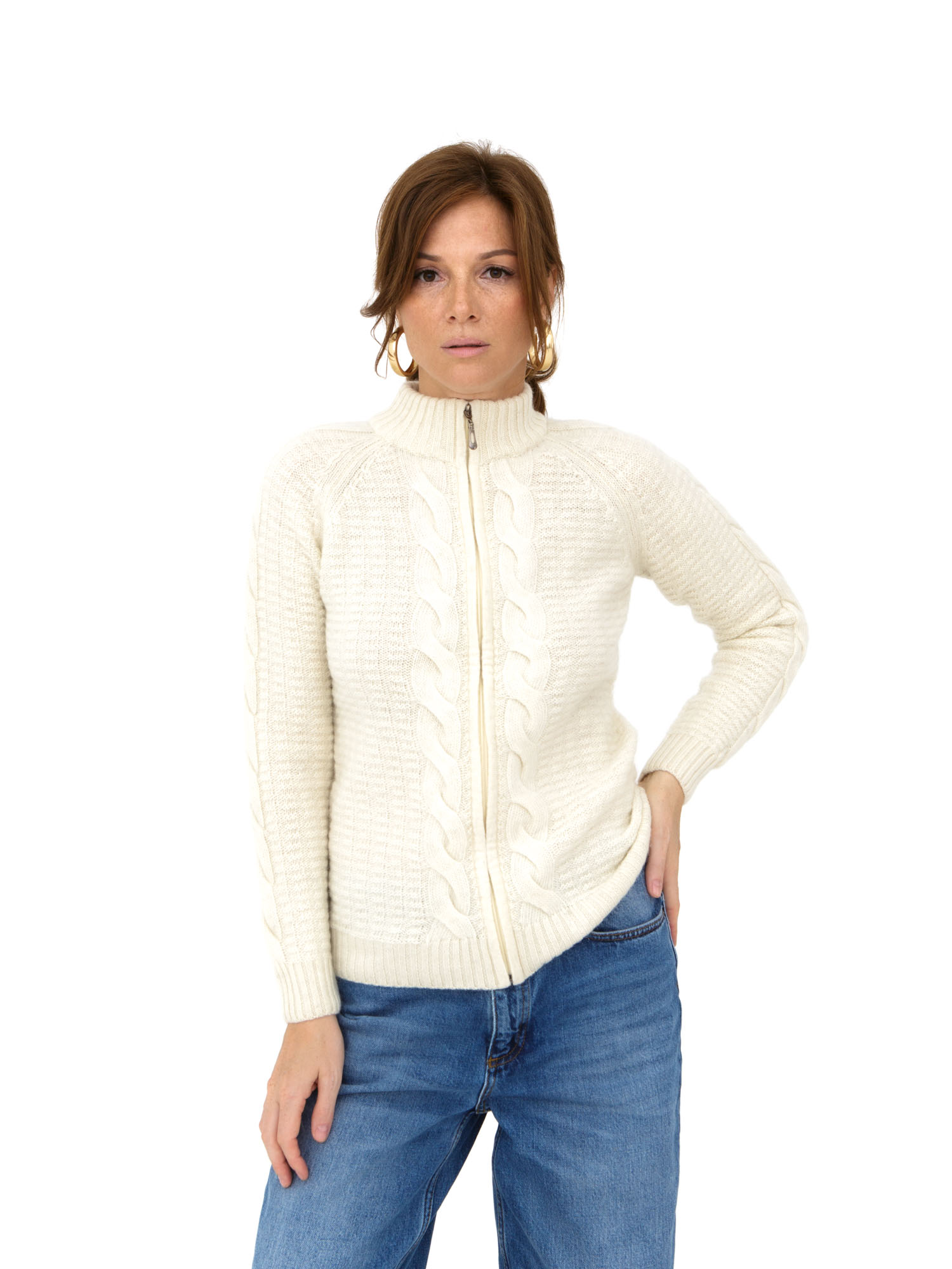 Модель выполнена в полуприлегающем силуэте с застежкой-молнией по всей длине, что обеспечивает дополнительный комфорт и возможность регулировать теплообмен. Высокий воротник надежно защищает от ветра и холода, создавая уютное ощущение в прохладные дни. Классическая вязка с традиционным узором подчеркивает натуральность материала и добавляет изделию стильный текстурный акцент.