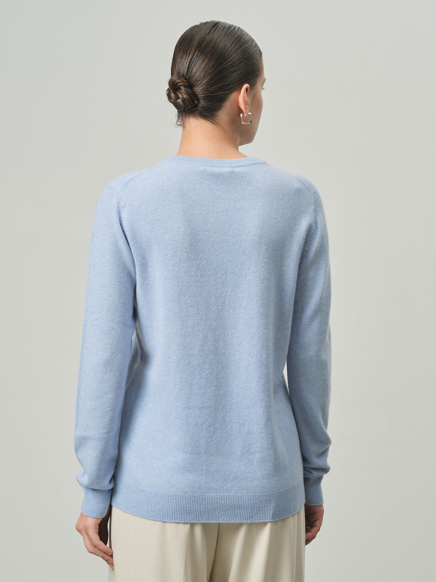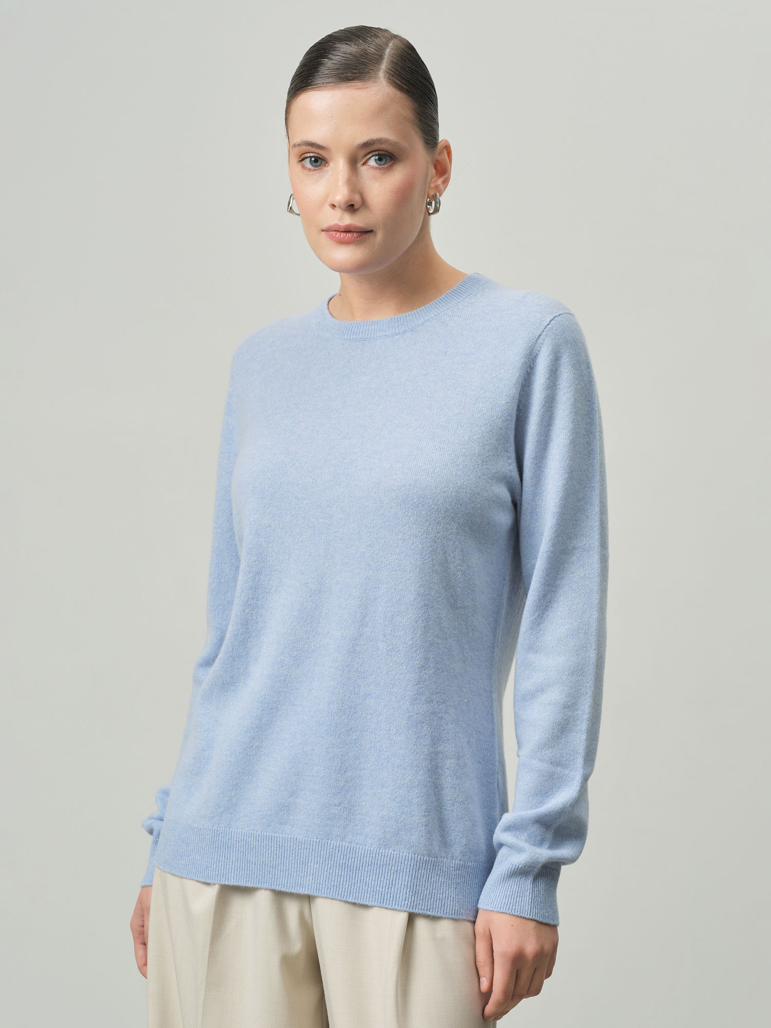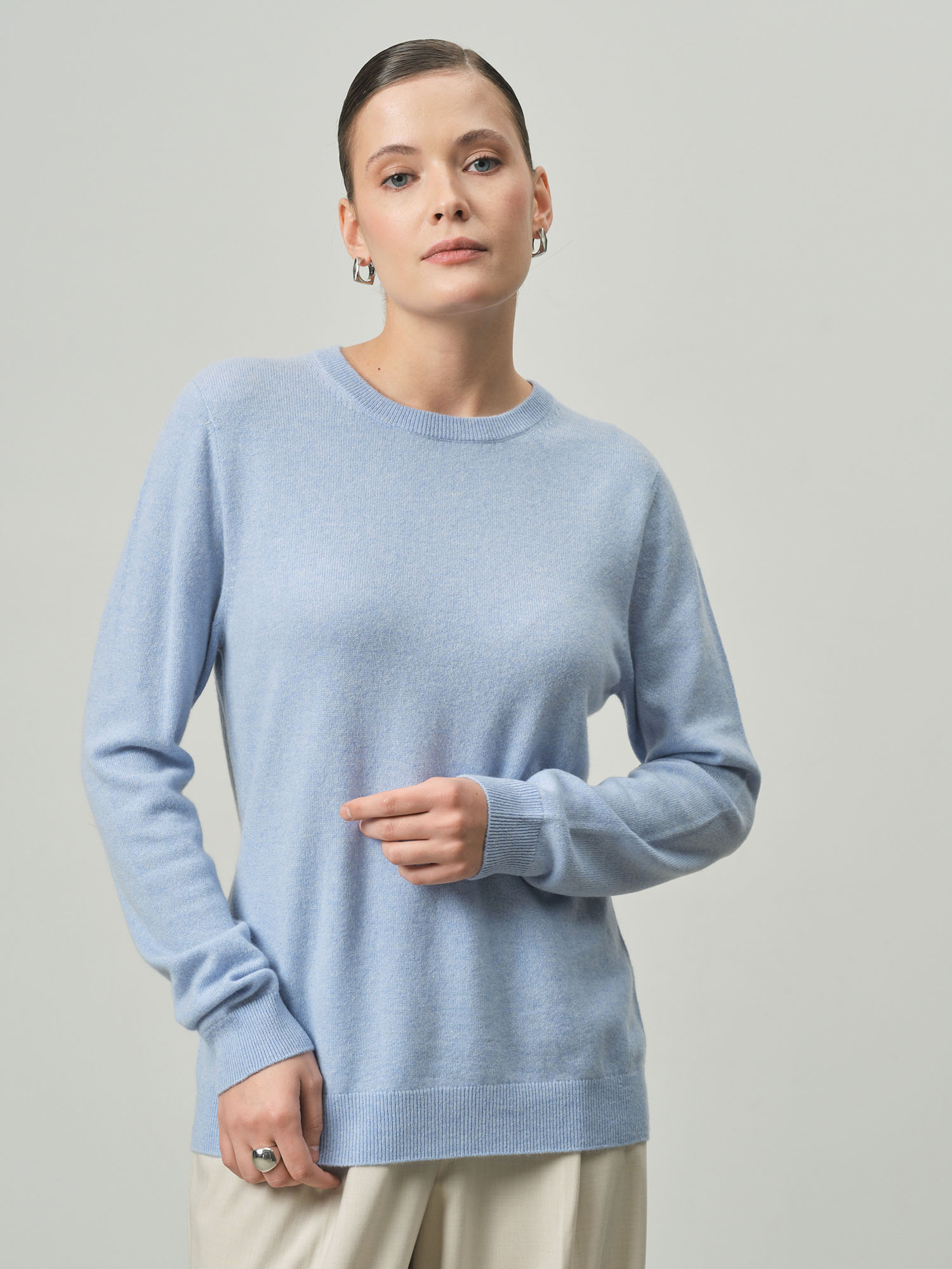 Модель выполнена с классическим круглым вырезом и гладкой вязкой. Чистые линии и минималистичный силуэт подчёркивают благородную фактуру кашемира и делают изделие универсальным.